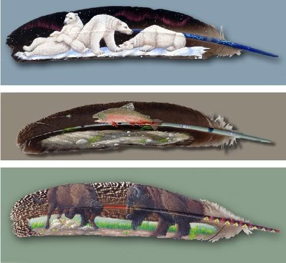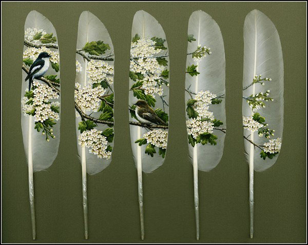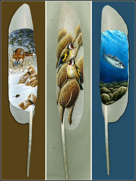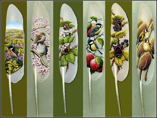 Рисовать картины на перьях птиц — древнее искусство народа маори. Современные художники овладели им в совершенстве. Последователи искусства коренного народа Новой Зеландии — художники, занимающиеся живописью на перьях птиц, — есть практически в каждой стране. Самые известные из них, во многом благодаря интернету, это американка Джулия Томпсон, использующая в своем творчестве перья павлинов и индеек, и британский художник Ян Дэйви, рисующий исключительно на лебединых перьях. ![]() Джулия Томпсон (Julie Thompson) начала заниматься своим непростым творчеством с 1990 года. Как утверждает сама художница, вначале она обратилась к этому занятию лишь для того, чтобы найти хоть какое-то применение перьям, выпавшим из крыльев павлинов, принадлежащих ее матери. «Никогда не делая этого раньше, но зная о скрепляющих свойствах акриловых красок, я решила, что это вполне осуществимый эксперимент», — говорит художница. Начав с простых сюжетов, со временем Джулия перешла к изображению более сложных рисунков. ![]() Джулия родилась и выросла на Аляске. По словам художницы, влияние величественных пейзажей ее родного края пронизывает большинство ее работ. Основные сюжеты Джулии Томпсон – картины из жизни дикой природы, но иногда художница изображает на павлиньих перышках и людей. На роспись одного перышка уходит от 8 до 16 часов. ![]() Джулия признается, что работает медленно, но точно, стараясь придать каждому изображению как можно больше жизни и эмоций. У художницы нет проблем с сюжетами, но иногда возникают проблемы с «холстами». Она рассказывает, что в Америке существует множество законов, защищающих птиц – вплоть до того, что в некоторых штатах нельзя собирать птичьи перья. Но Джулия не унывает и основную ставку делает на павлинов и индеек, содержащихся на ранчо ее матери в Южной Калифорнии. ![]() Расписанные перышки Джулии Томпсон известны во всем мире и вполне успешно продаются через ее сайт. За одно перо, заключенное в стекло под рамочку, просят 295 долларов. Бывает лебединая верность и лебединая песня, лебединая шея и лебединое озеро. А британский художник Ян Дэйви (Ian Davie) к этому списку добавил еще и лебединую живопись. Художник рисует очень красивые картины на белоснежных лебединых перьях, которые собирает каждый год во время линьки этих изящных, величественных птиц. ![]() Яну Дэйви крупно повезло: рядом с его домом находится пруд и питомник для королевских лебедей, где художник проводит массу времени, собирая сброшенные птицами перья, которые потом пускает в работу. Предварительно отчистив, отмыв и высушив, а потом обработав «материалы», чтобы они стали пригодны для рисования. Обычно у художника есть наброски и даже эскизы тех картин, которые он планирует перенести с бумаги на перья, но иногда он рисует экспромтом, — настолько его вдохновляют прогулки у пруда с лебедями. ![]() Так, любимый прием Яна Дэйви — это «широкоформатные» картины, которые растягиваются на несколько перьев. Они и выглядят куда выигрышнее «обычных» вертикальных работ, и рисовать их интереснее. Для рисования на перьях автор использует специальные акриловые краски на водной основе, которые не повреждают перья, быстро высыхают и хорошо держатся за поверхность пера. Вероятно, сказывается опыт, приобретенный Яном Дэйви за годы работы таксидермистом (изготовление чучел животных и птиц)